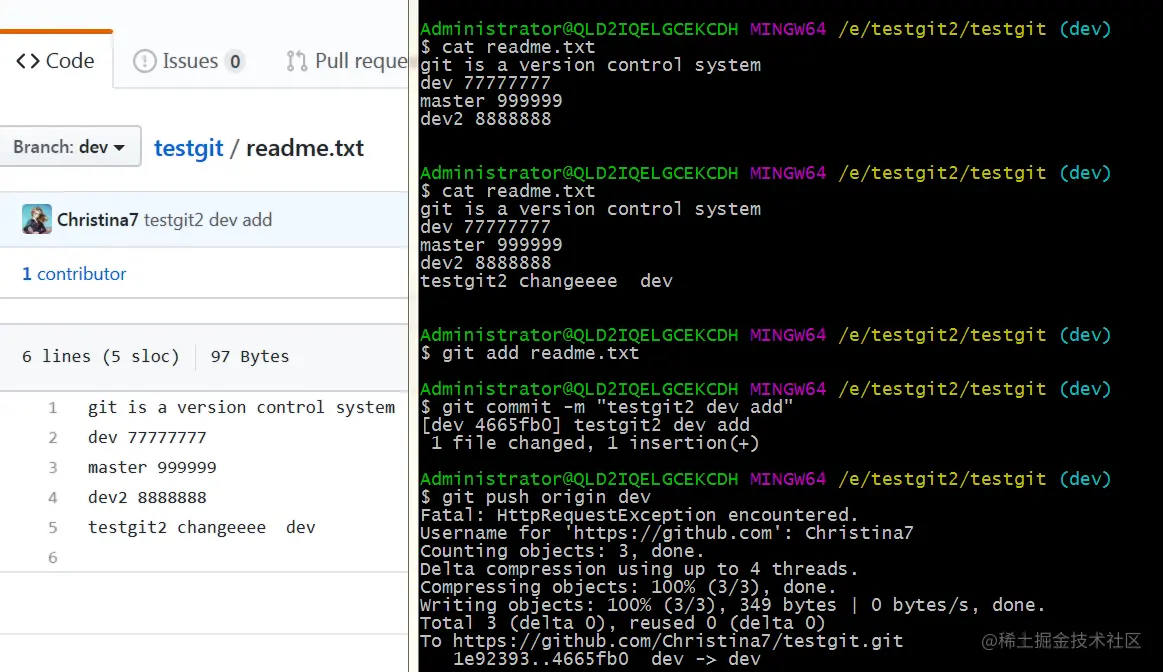 - 修改后,add/commit,最后将dev分支push到远程$ git push origin dev