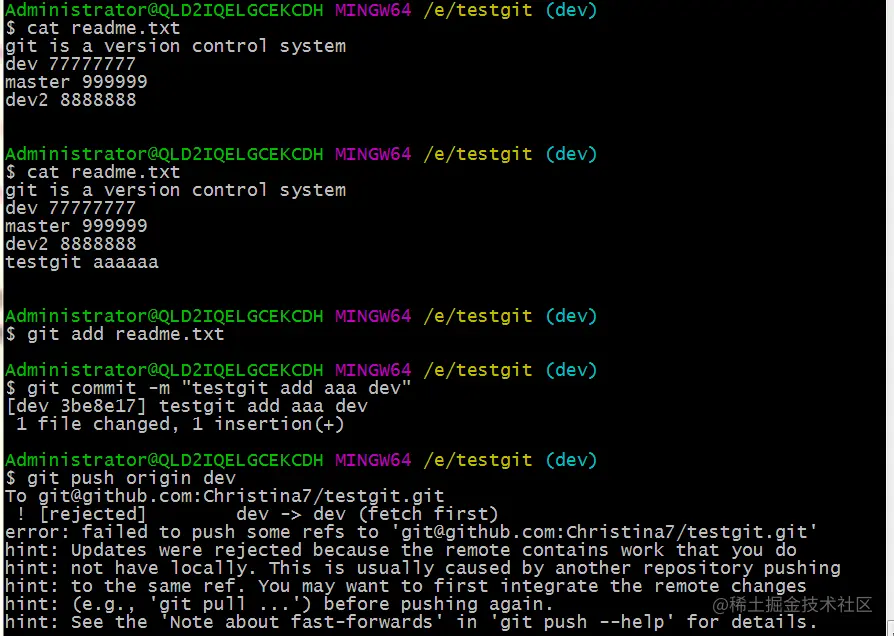 这样小伙伴就在origin/dev分支上推送完成了提交,而我在另一个目录,也对同一个文件同一处做修改,试图推送时会出现冲突。即不同的人推同样的文件到dev,修改同一个文件的同一个地方出错,有冲突