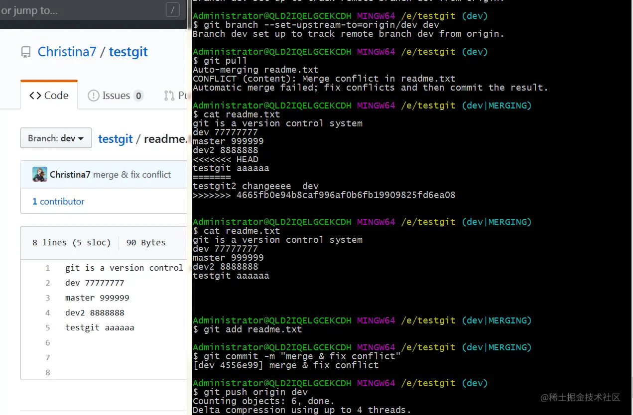 - 再用git pull把最新的提交从origin/dev抓取下来,本地合并,手动解决冲突