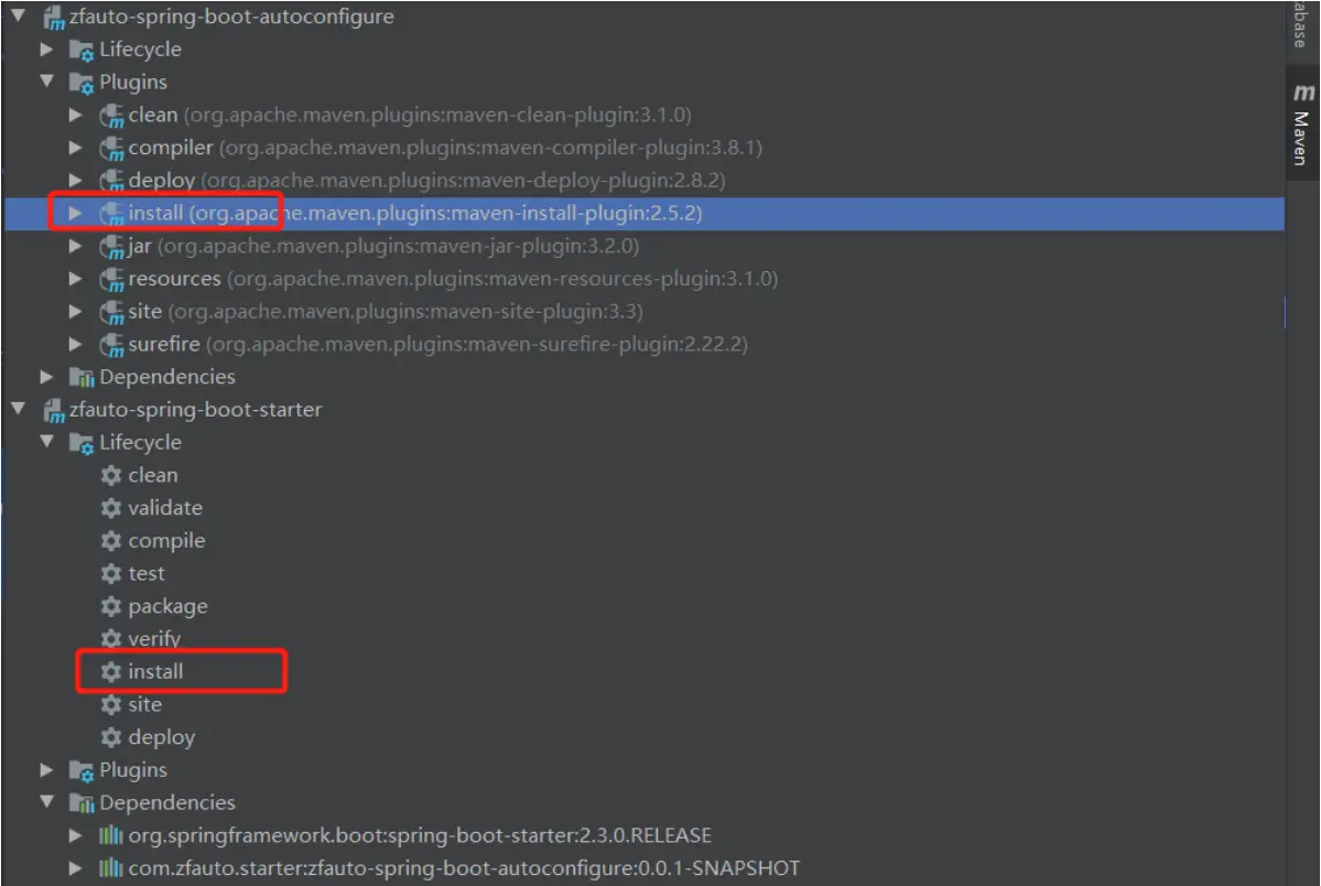 最后我们 分别将项目打包,由于zfauto-spring-boot-starter是依赖于zfauto-spring-boot-autoconfigure,所以我们先对zfauto-spring-boot-autoconfigure进行打包,然后通过 mvn install 打到本地仓库(如何打包见下图)。