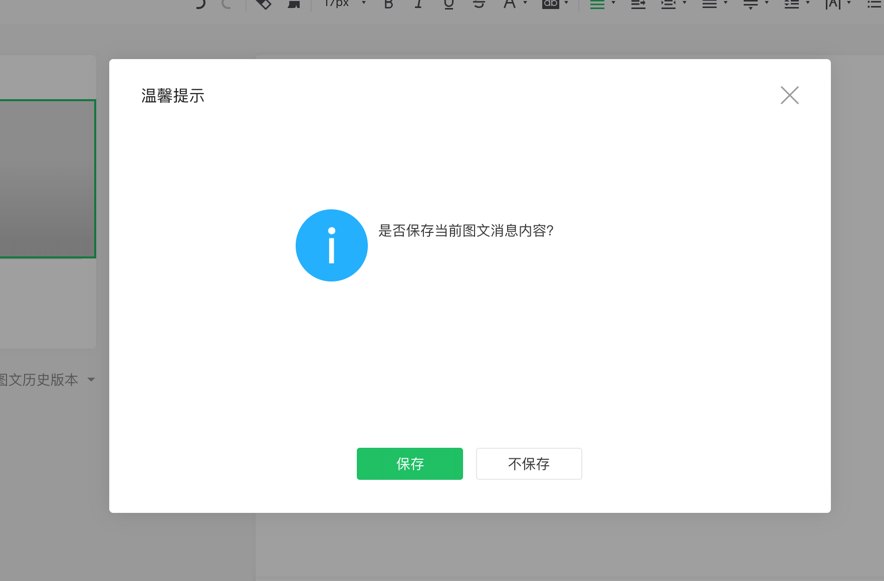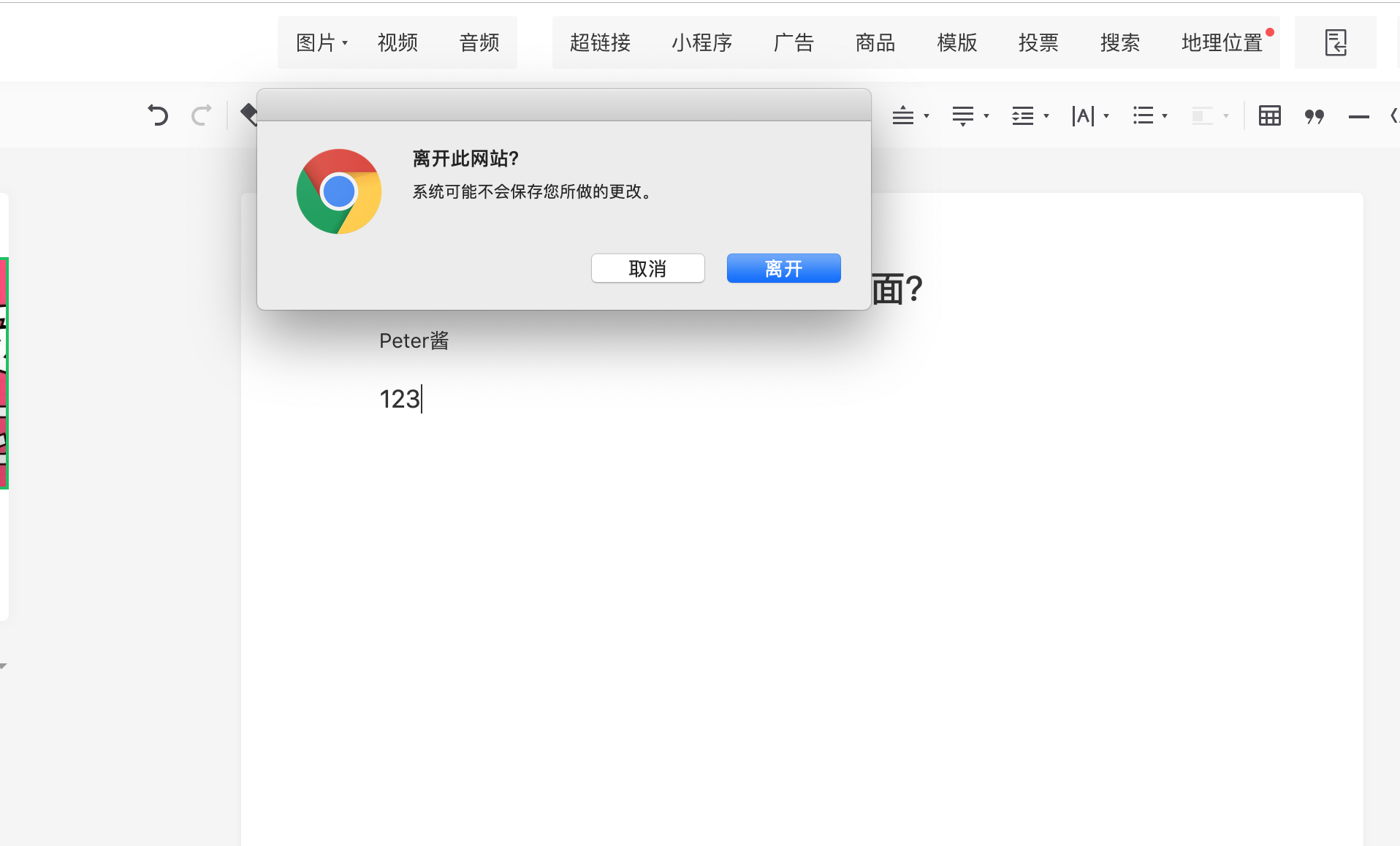 - 在微信公众号编辑器界面,输入一部分内容后,点击关闭tab页,此时出现弹窗