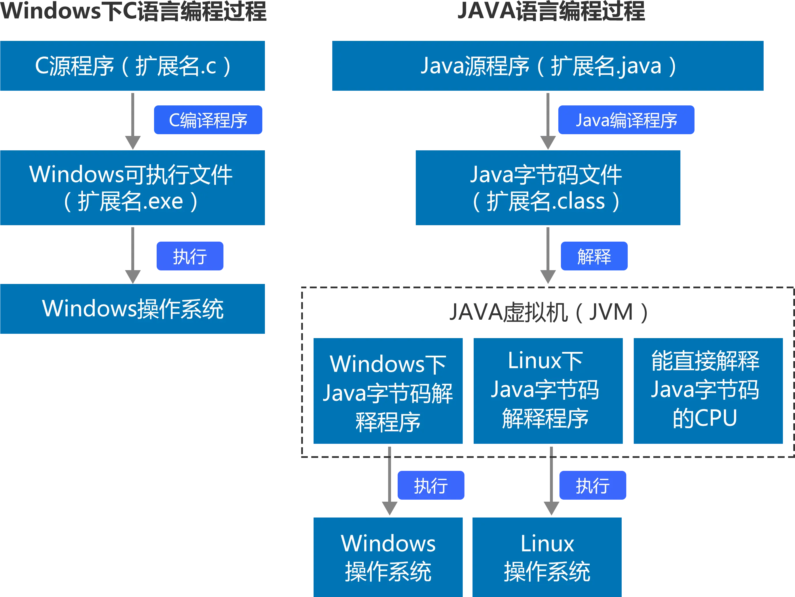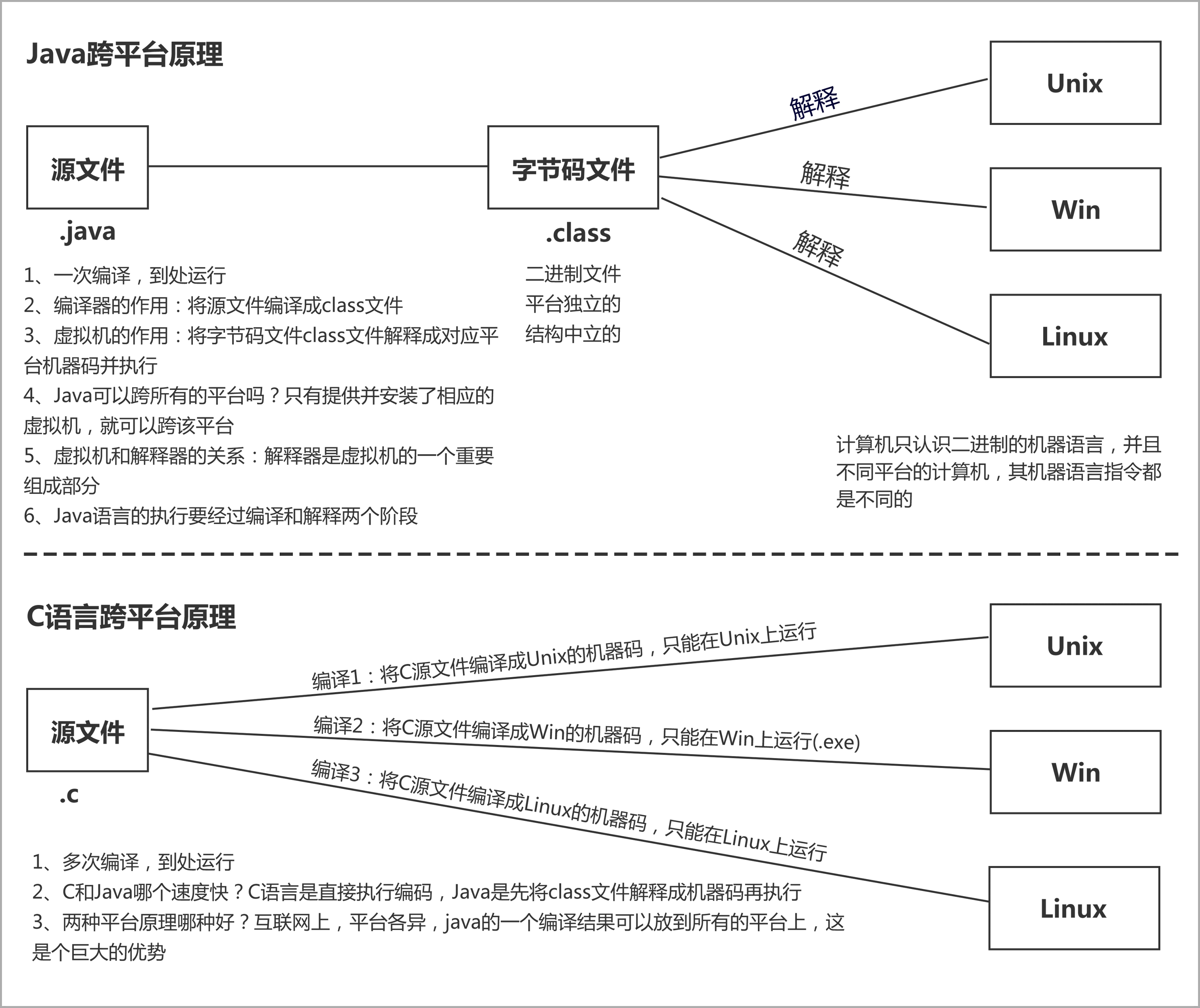 Java源程序(.java)要先编译成与平台无关的字节码文件(.class),然后字节码文件再解释成机器码运行。解释是通过Java虚拟机来执行的。