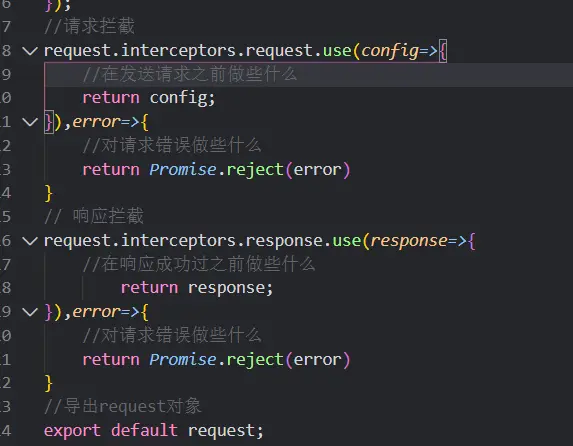 打开request.js文件import引用axios,创建axios实例,并添加请求拦截器,响应拦截器并导出