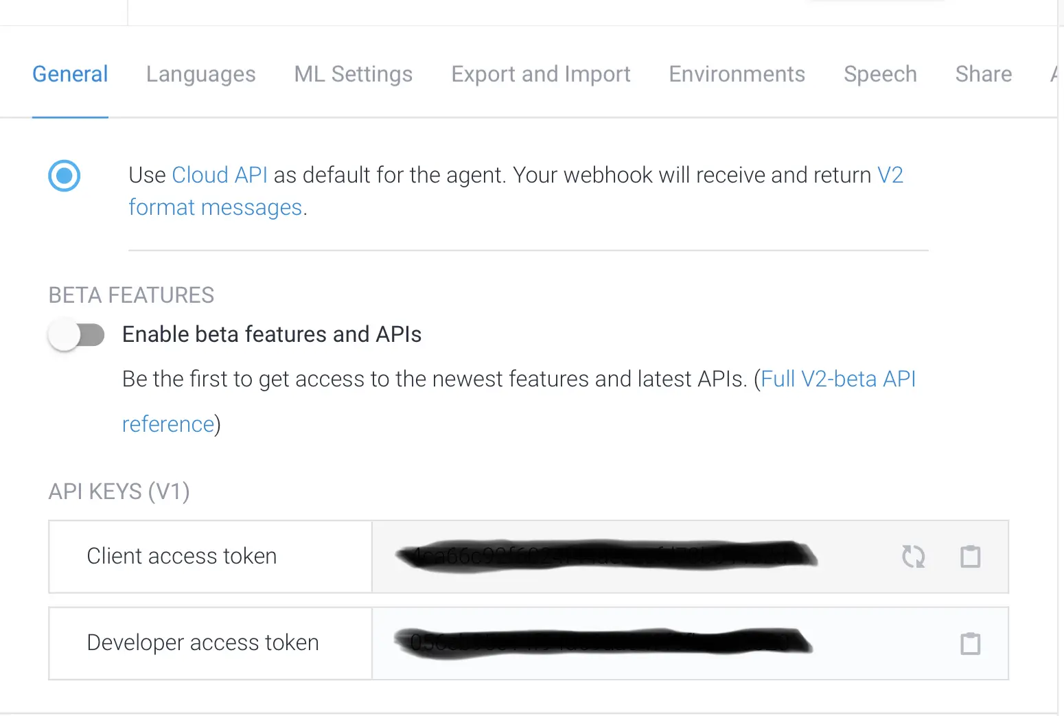 但是V2 API是需要大家在Google Cloud Console -> iAM -> Service Account里面创造授权账号并赋予 Dialogflow API Admin权限。 而且,如上图所示,我们必须要在项目配置中把Agent的V2 API权限打开。