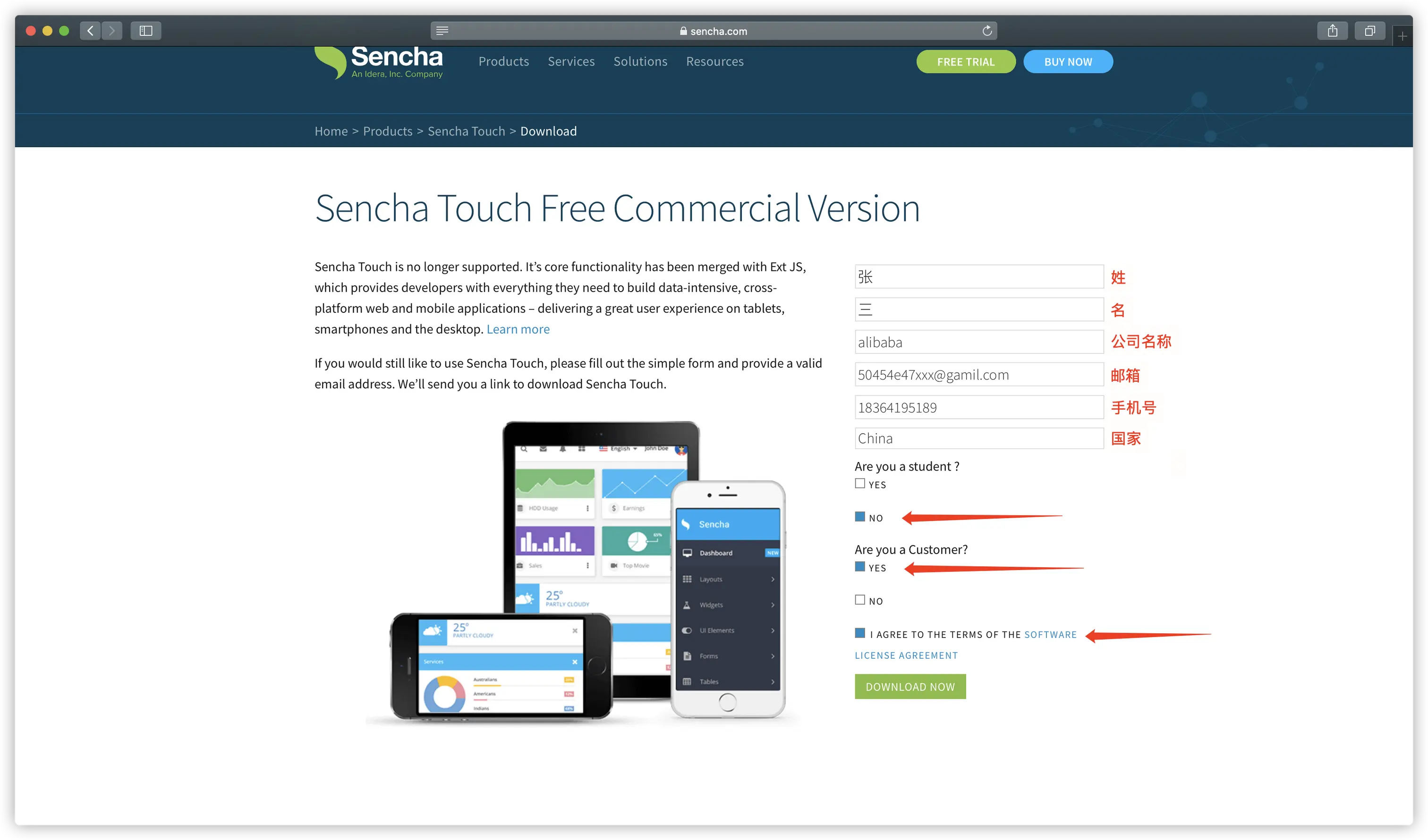 - 首先打开sencha touch网站,根据提示输入以下信息,点击DOWNLOAD按钮,稍后你会收到一封包含下载链接的邮件。注意尽量使用国外的邮箱,比如Gmail,不然你可能收不到邮件。