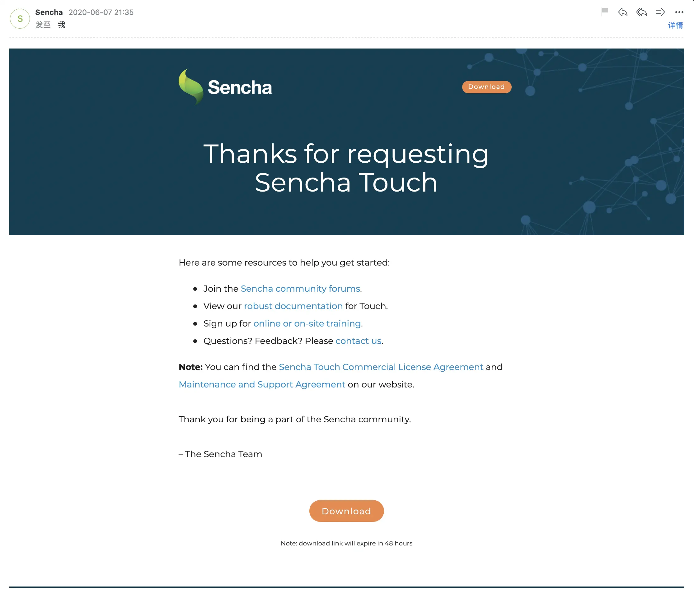 - 登录邮箱,找到Sencha Touch官网发来的下载链接,点击Download按钮,下载完成后解压到指定目录即可,之后在使用sencha cmd创建项目时,教大家如何使用sencha sdk。