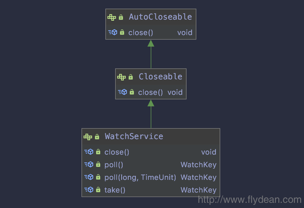 监控的服务叫做WatchService,被监控的对象叫做Watchable: