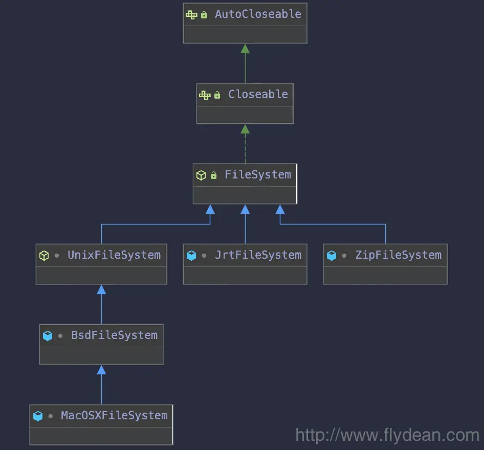 在我的mac系统上,FileSystem可以分为三大类,UnixFileSystem,JrtFileSystem和ZipFileSystem。我猜在windows上面应该还有对应的windows相关的文件系统。小师妹你要是有兴趣可以去看一下。