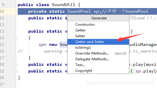 可以看出,自动生成了包含两个属性的构造方法,很是方便快捷,生成getter/setter方法和生成构造方法比较类似,同样选中这两个属性并按下快捷键,选中Getter and Setter,如下图所示。