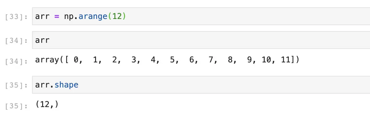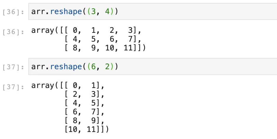 因为是1维的,所以我们去看它的shape也只有一维。假设我们不喜欢这样的一维数组,而想把它变成3 x 4或者是6 x 2的格式,这时候使用reshape就会很方便。