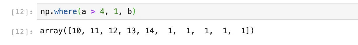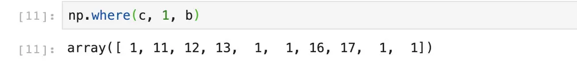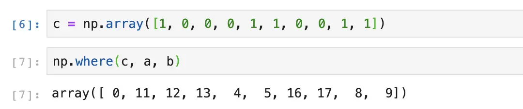 在这个例子当中,c数组中的1和0分别表示True和False。当我们调用np.where的时候,numpy会自动根据c数组当中的值去选择从a数组还是b数组当中获取数据。相当于我们执行了这么一段代码: