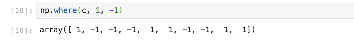 虽然两者的运行结果是一样的,但是显然使用循环的方法计算耗时更长,而使用numpy的向量做法运算速度更快。除此之外,numpy的where方法还支持高维的数组,但是循环的方法不行。并且where还有一些更高级的用法,比如说我们传入的第二个和第三个参数,可以不是数组而是一个标量。比如我们可以指定当c中的元素是True的时候填入1,否则填入-1: