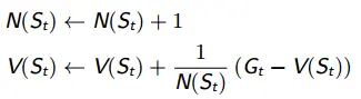 之前的蒙特卡洛算法需要采样大量轨迹,之后再统一计算平均数。 使用增量式算法,在每一条轨迹之后都得到值函数的估计值