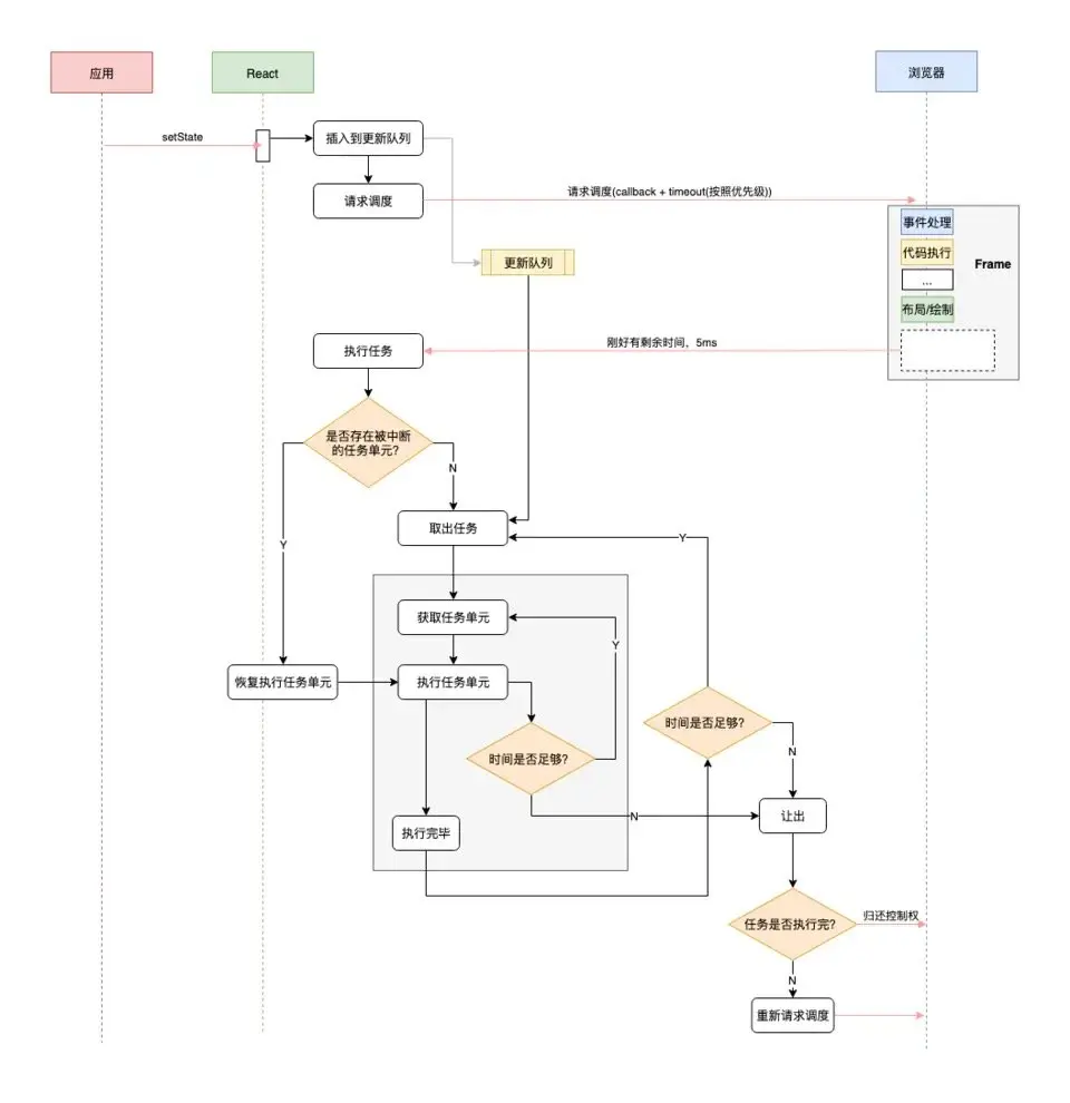scheduler(调度)通过 requestIdleCallback 请求浏览器调度,浏览器会在帧空闲时执行回调,交出控制权。