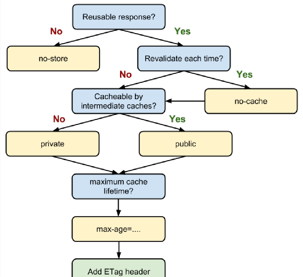当我们的资源内容不可复用时,直接为 Cache-Control 设置 no-store,拒绝一切形式的缓存;否则 考虑是否每次都需要向服务器进行缓存有效确认,如果需要,那么设 Cache-Control 的值为 nocache;否则考虑该资源是否可以被代理服务器缓存,根据其结果决定是设置为 private 还是 public;然后考虑该资源的过期时间,设置对应的 max-age 和 s-maxage 值;最后,配置协商缓存 需要用到的 Etag、Last-Modified 等参数。