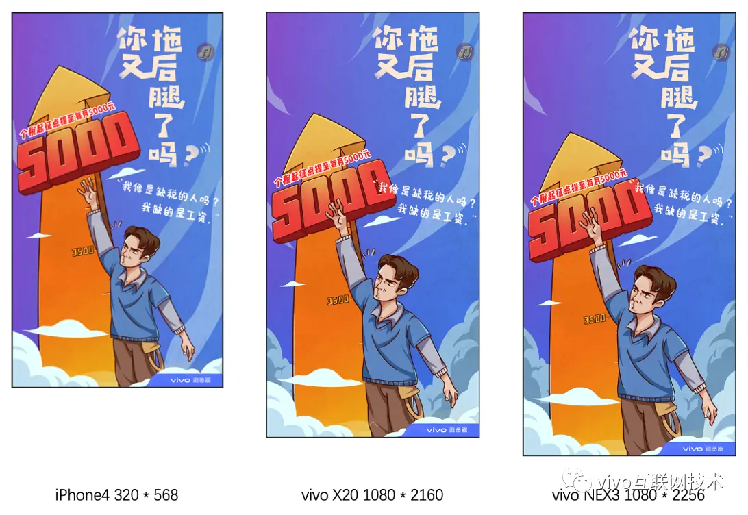 随着移动端生态的日益繁荣,设备屏幕宽高比从 3:4、9:16 到 9:19、9:21 ,分辨率从 480p 、720p 到 1080p 甚至 2k ,显然设计师同学不可能针对每种场景都进行对应的创作,所以一般只就约定的标准尺寸(如常见的 1080 * 1920 )输出一张设计稿。