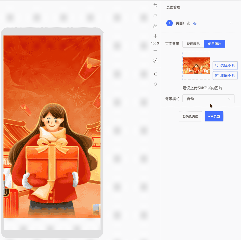 即通过在用户配置页面的时候提供页面背景图和内部元素的属性、定位行为预设,实现产出页面对不同视口的良好适配。