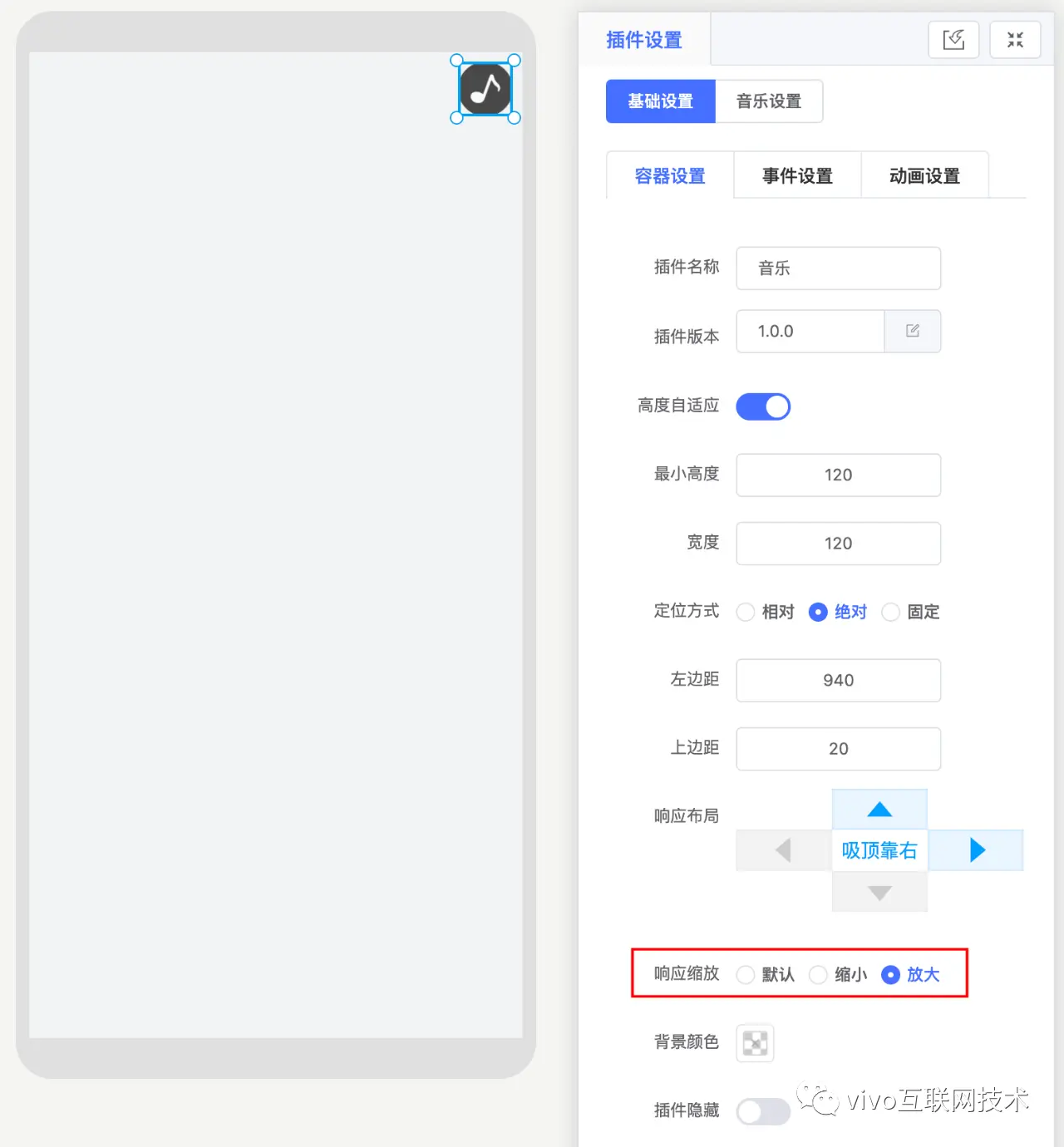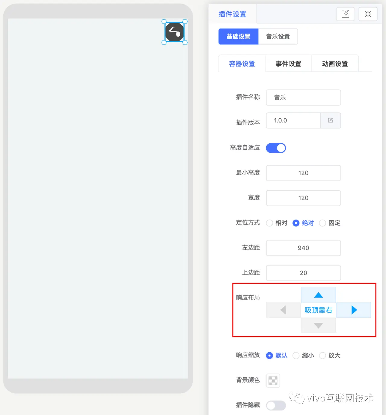 目前基于行为预设的动态布局方案已经作为 悟空活动中台 上单页满屏场景的默认布局配置方案,用户可以通过简单的两步操作,便可调选中元素的吸附和缩放特性进行预设: