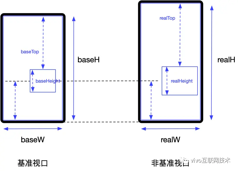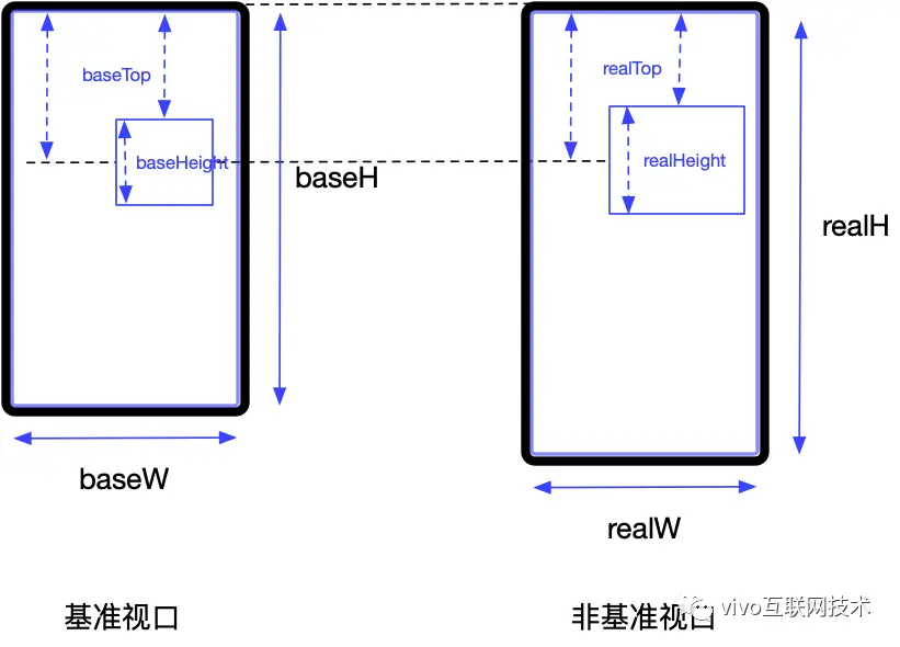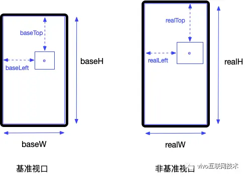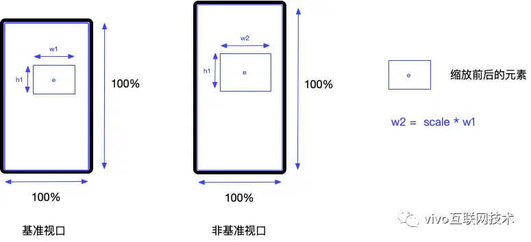 使用 scale 描述元素在实际视口与标准视口下的缩放比,设元素在基准视口下的宽高为 width 和 height ,则元素在实际视口下的宽高分别为 baseW * scale 和 baseH * scale 。