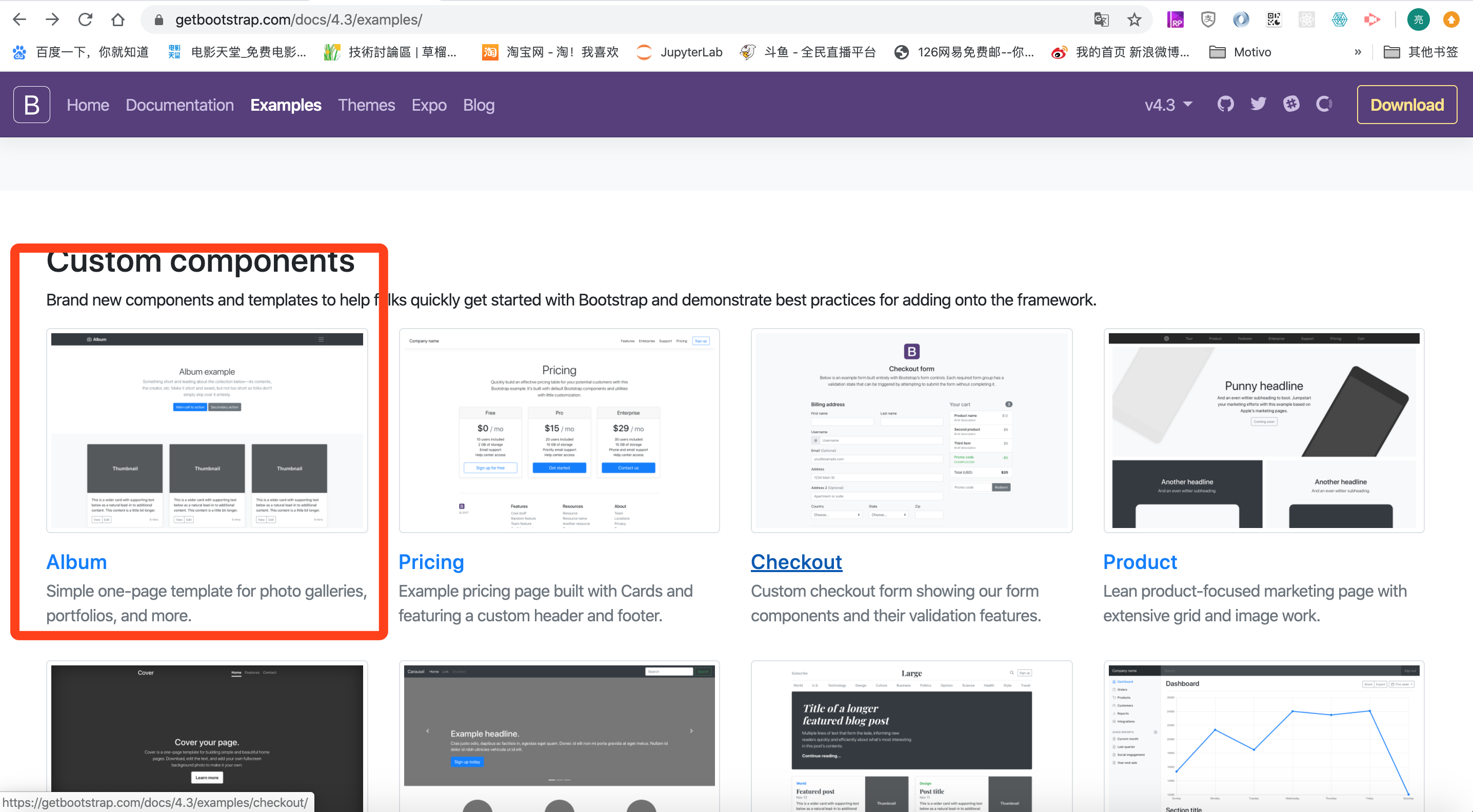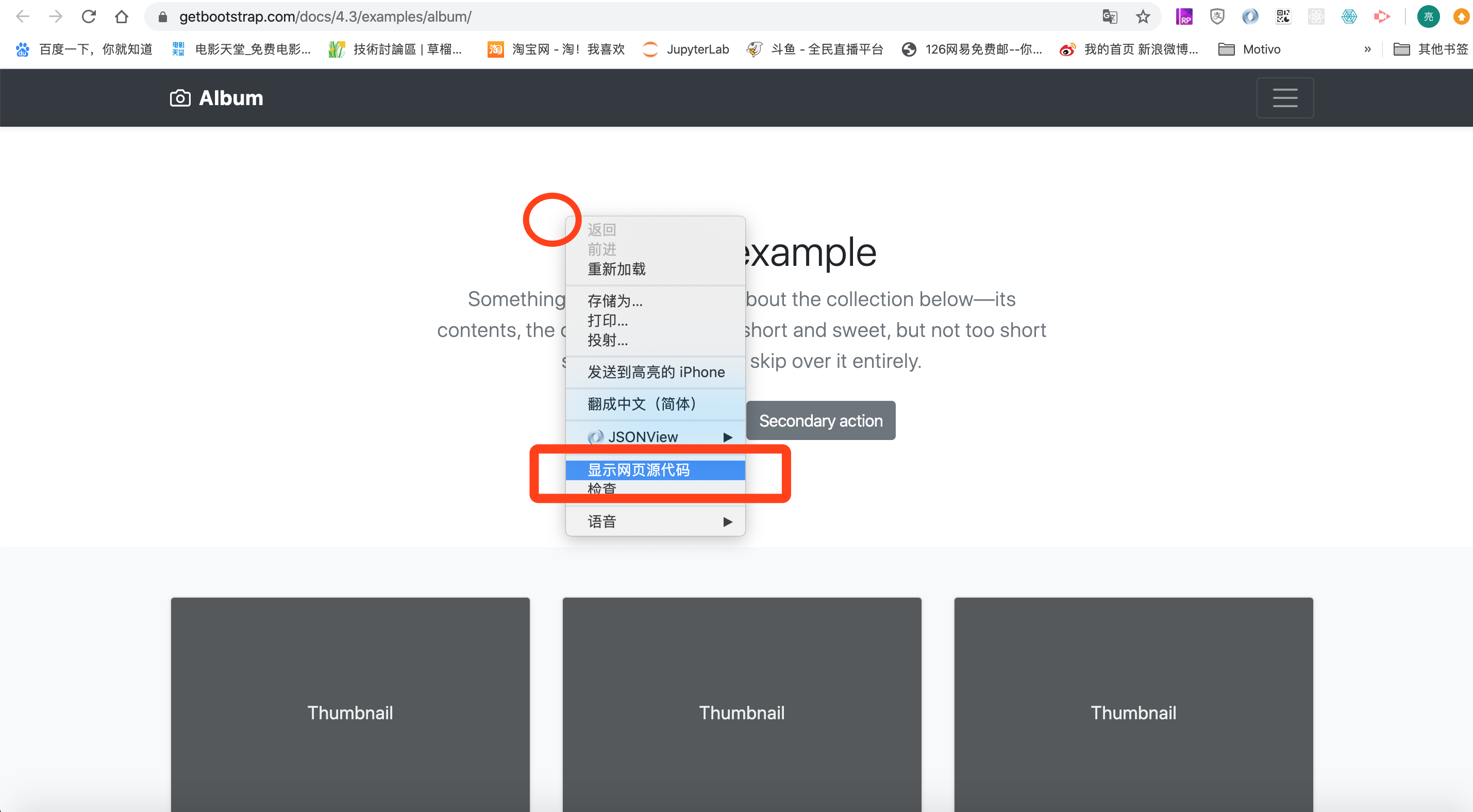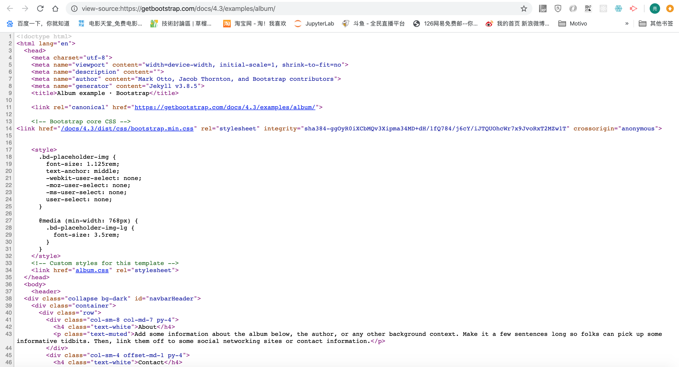 我们可以去Bootstrap的官网例子页面,去随便找一个例子。