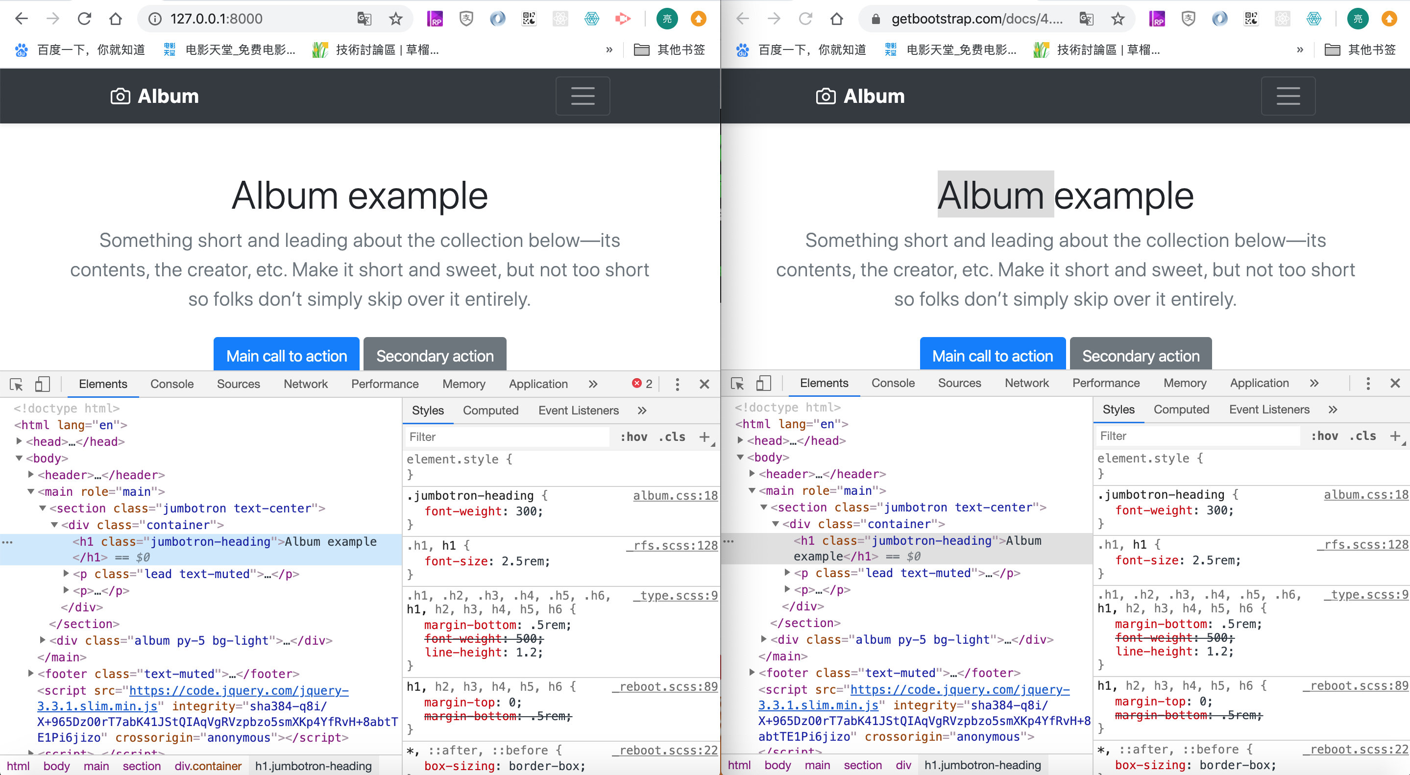 我们要做的只需要把这些部分导入就好,但是具体怎么导入呢?这个很简单。来到Bootstrap的文档页面,基本第一篇QuickStart里面介绍的,只需要在html文件的header标签里面添加scrapy标签就可以,文档地址: