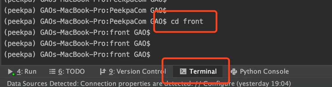 首先进入项目,在Terminal里面,通过命令$cd front进入到front目录下: