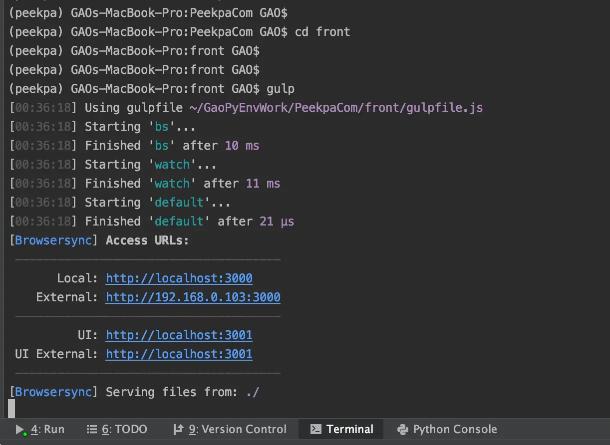 然后直接输入$gulp命令,因为我们在前面的文章里面讲述了安装gulp,所以这里就会直接启动gulp,出现如下画面:
