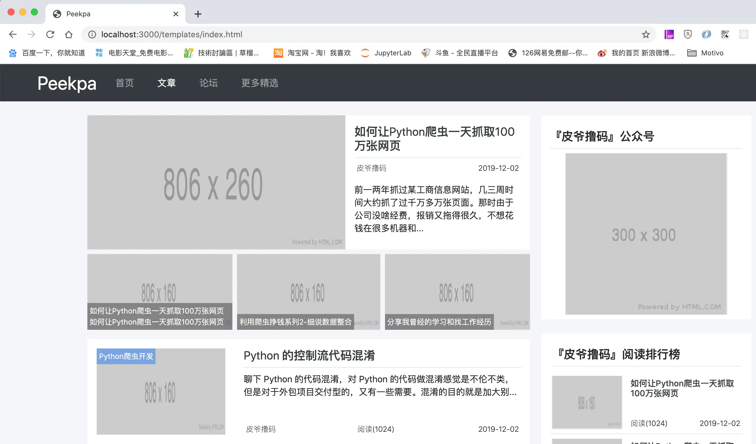 我们的首页很简单,分为顶部的导航页面,Header文章区,文章列表区,以及右侧的专栏说明区域。编写好之后就是大概长这个样子: