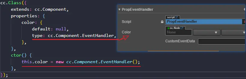 要想在属性面板绑定回调函数,需设置属性的type为cc.Component.EventHandler,设置默认值为空,并且在构造函数中初始化属性为cc.Component.EventHandler的实例。
