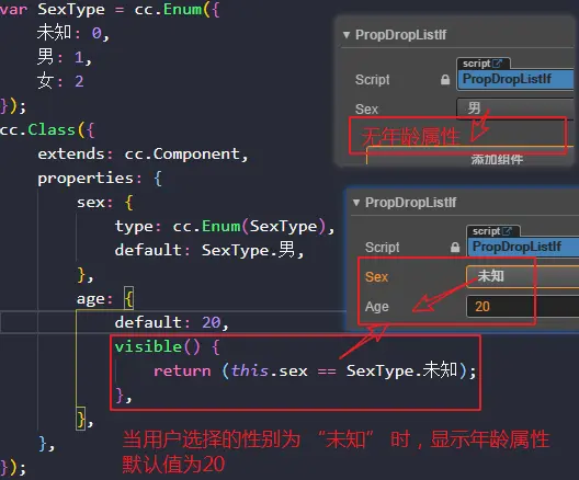 要想选择不同的下拉选项,在属性面板上显示或隐藏不同的属性,需把要动态设置可见性的属性的visible写成函数的形式,并在函数中根据不同的情况返回不同的布尔值。
