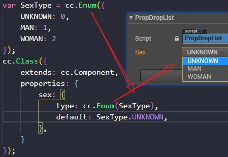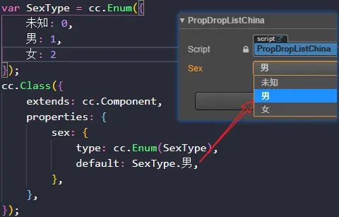 要在属性检查器上显示为下拉列表的样式,需设置属性类型为枚举,并设置默认值为枚举值。为了设置为枚举,需定义一个枚举类型,可以使用Cocos提供的cc.Enum定义枚举。