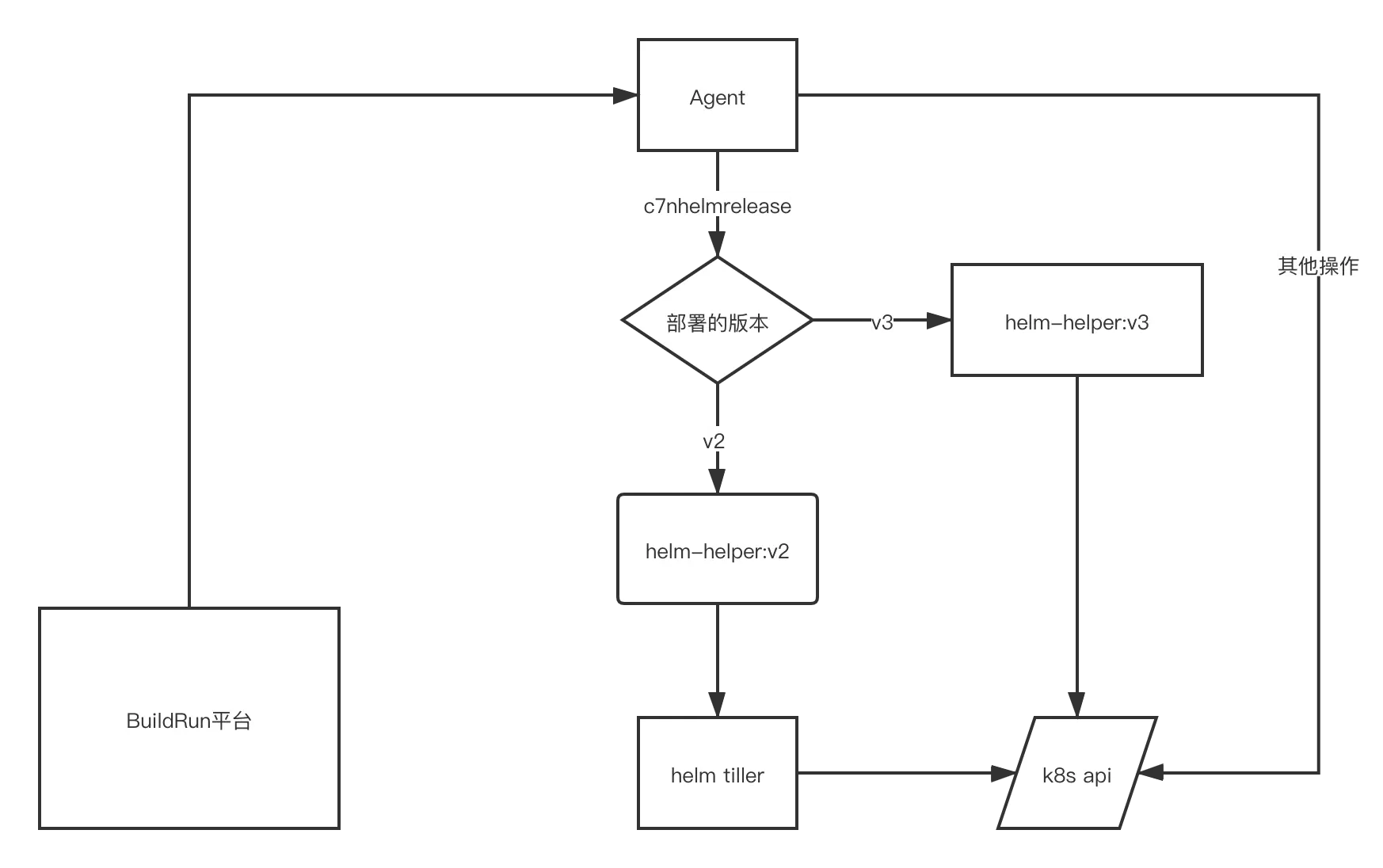 如果用户部署v2版本,则helm-helper:v2会随之一起部署,如果用户部署v3版本则会一起部署helm-helper:v3,helm-helper:v2 与helm-helper:v3 为agent提供相同的接口,agent在进行helm操作时,可直接调用helm-helper接口,达到兼容v2和v3的目的。