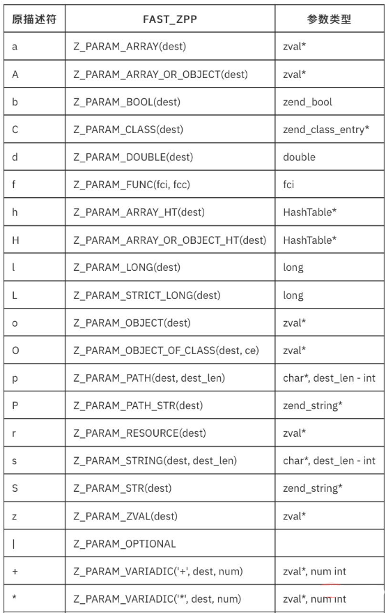 a A b C d f h H l L o O p P r s S z * + | / !根据不同的组合来表示我们的PHP函数要接受的参数类型,比如例子中的count, 通过”z|l”表示要接受一个zval类型的参数,和一个可选的long类型的mode参数,当zend_parse_parameters在runtime的时候被调用的时候,就会需要分析这些字符,然后调用对应的逻辑,对于一些本身就很简单的函数来说,比如count,这个开销就会显得很明显。