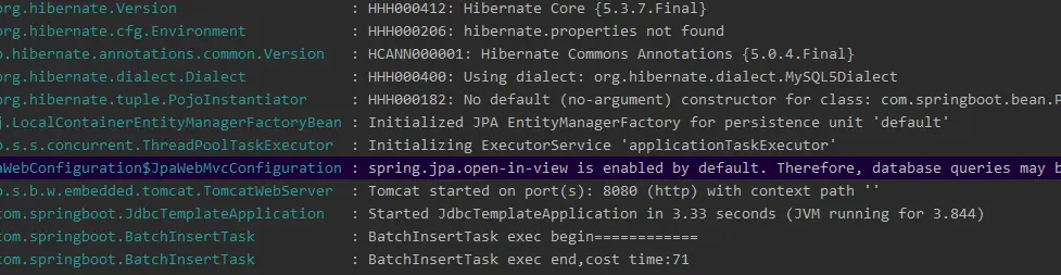 根据执行结果进行对比发现:使用JdbcTemplate进行批量插入操作的耗时比循环单条数据插入执行耗时降低了几个几何级数,提升效果异常明显,原因在于JdbcTemplate批量插入操作时采用的一次事务插入所有数据,而单条数据插入时每次插入都要重建事务,事务的频繁创建和提交耗时巨大,而使用批量操作则不会出现这样的问题;