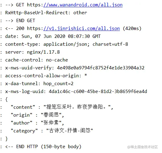 上面这个示例的请求地址将从https://www.wanandroid.com/all.json转移到https://v1.jinrishici.com/了。