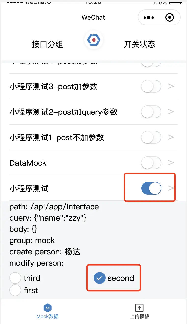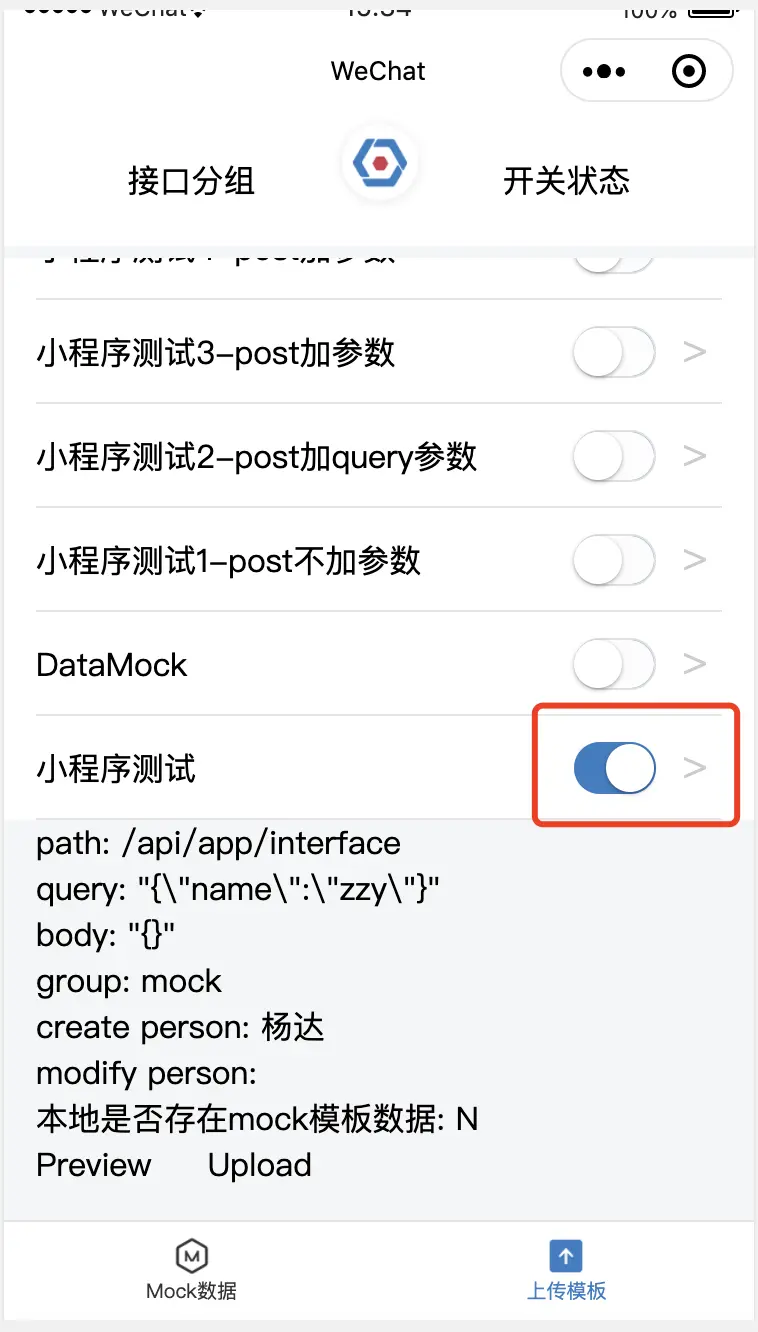 上传模板: 上传模板功能的适用场景是当你已经有了一个真实的接口,需要针对不同的用户场景进行测试但是同时接口返回的数据量比较庞大,所以我们为你提供了上传模板的功能。当你打开上传模板中指定接口的开关时,我们会拦截并保存你真实接口返回的数据并提供json预览功能。点击上传即可上传你的模板数据到Dokit平台端。