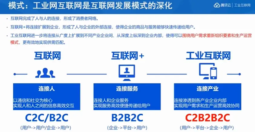 从模式方面来说,早期的微信、QQ等软件连接了人,实现C2C/B2C。在2015年左右国家提出各行各业要实现互联网+,将企业的服务与用户进行连接,像美团、滴滴等都是在这个阶段出现的B2B2C的服务。而最近一段时间,国家正式提出七大新型的数字化基建,也就是一种连接产业的能力,做到C2B2B2C,实现两端都是用户,通过企业、平台连接。