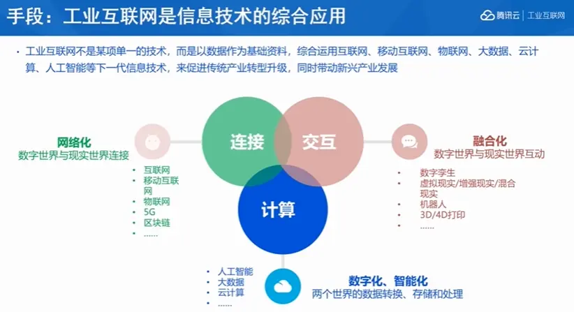从手段上来说,腾讯作为一家互联网公司,有三个能力是可以跟实体经济进行融合的。第一个是连接的能力,将数字世界与现实世界进行连接,实现网络化。第二个是交互的能力,做到数字世界与现实世界的互动,实现融合化。第三个就是计算的能力,利用大数据、云计算等做到两个世界的数据转换、存储和处理,实现数字化、智能化。