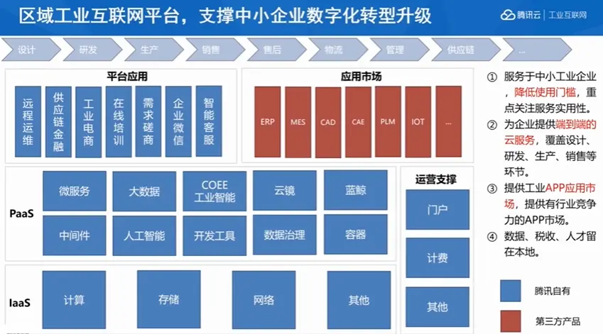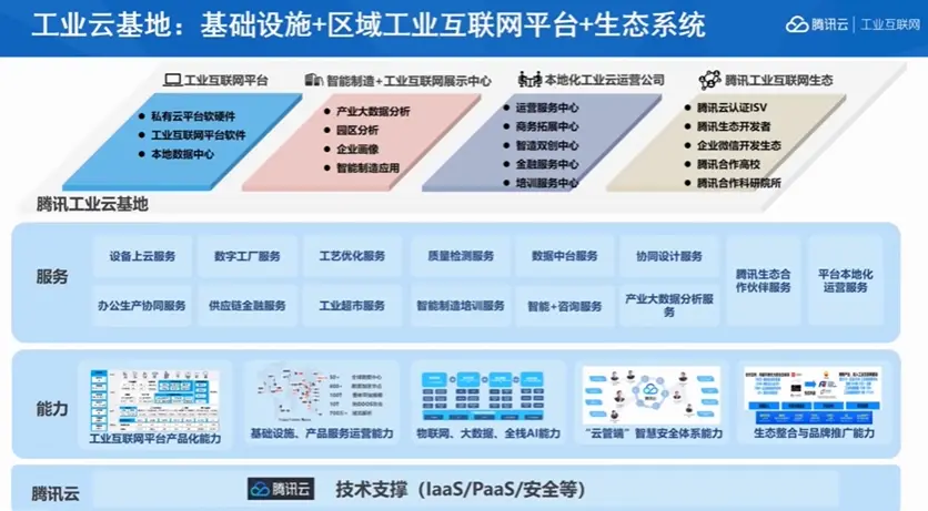 过去的两年间,腾讯打造了一些腾讯工业云基地以及结合当地产业的区域工业互联网平台。所谓工业云基地就是基础设施+区域工业互联网平台+生态系统的三维立体的能力。