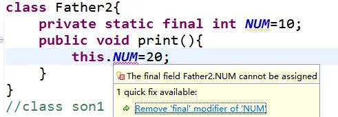 - 没有在声明时初始化final变量的称为空白final变量(blank final variable),它们必须在构造器中初始化,或者调用this()初始化。不这么做的话,编译器会报错“final变量(变量名)需要进行初始化”。