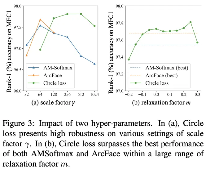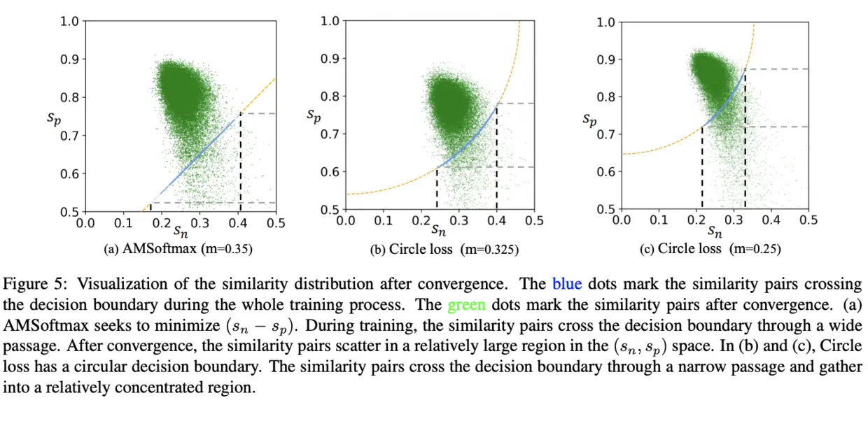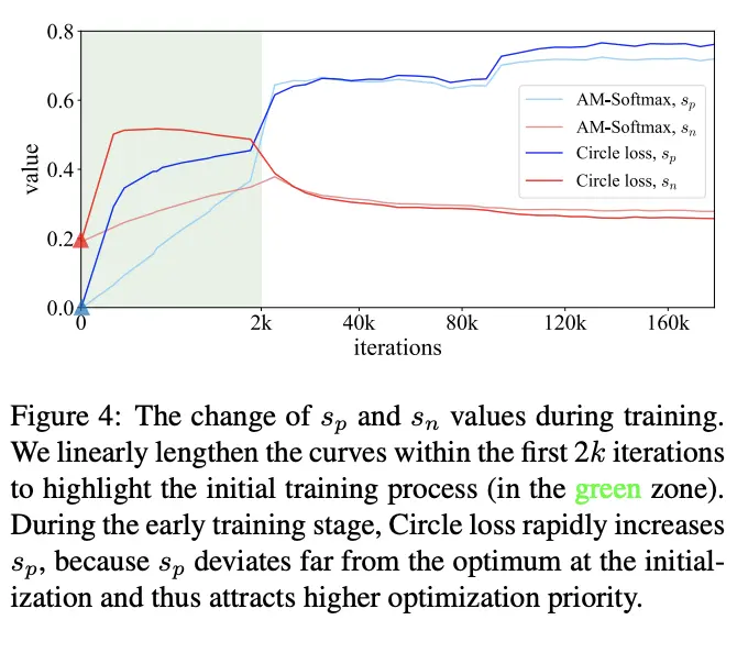 得到了显著的较大权重,占据了训练,使得相似度快速增加,这证明了Circle loss使用更灵活且平衡的优化手段。