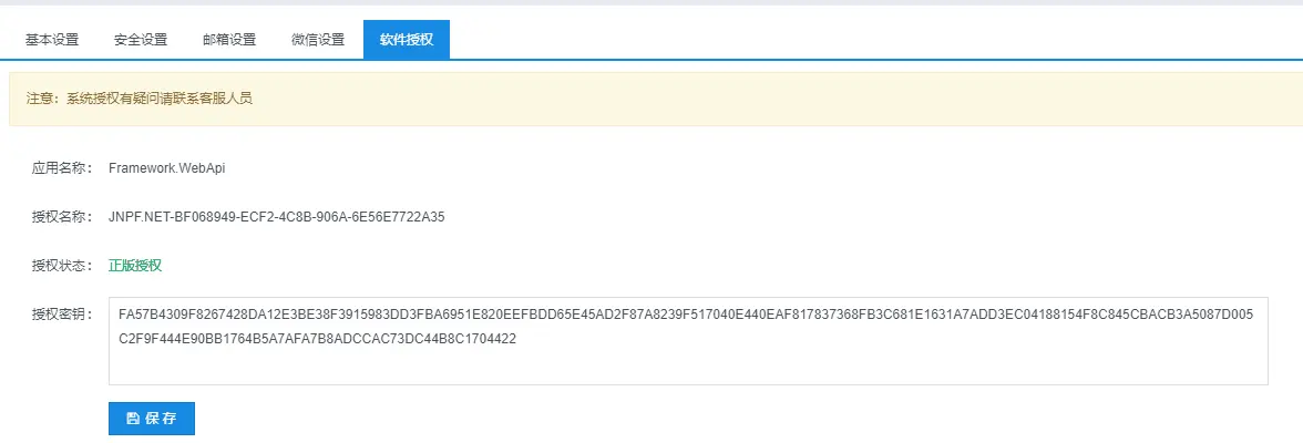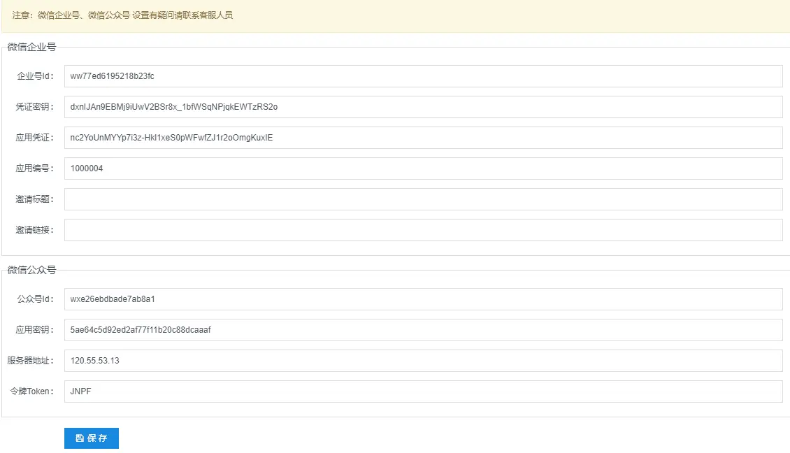 微信设置页面、进行企业微信基本信息填写有企业号ID、凭证秘钥、应用凭证、编码、要求标题、连接等,微信公众号有公众号ID、应用秘钥、服务器地址、命令Token等信息填写,信息填写完毕点击保存按钮;