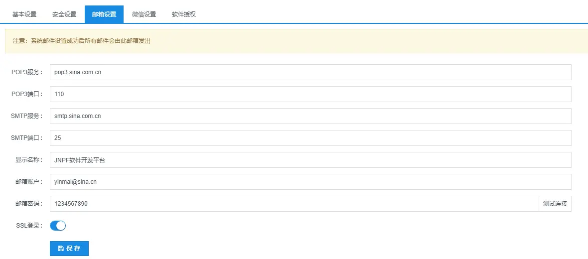 邮箱设置进行POP3服务、POP3端口、SMTP服务、SMTP端口、显示名称、账户喝密码、是否登录等信息数据填写完点击保存按钮,或以下微信设置;