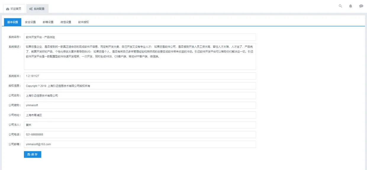 在系统配置一系列基本信息,使大家对系统和公司的了解,在系统应用目录下操作系统配置功能,在系统配置里面需要填写系统基础设置、安全设置、邮箱设置、微信设置、软件授权功能界面填写。