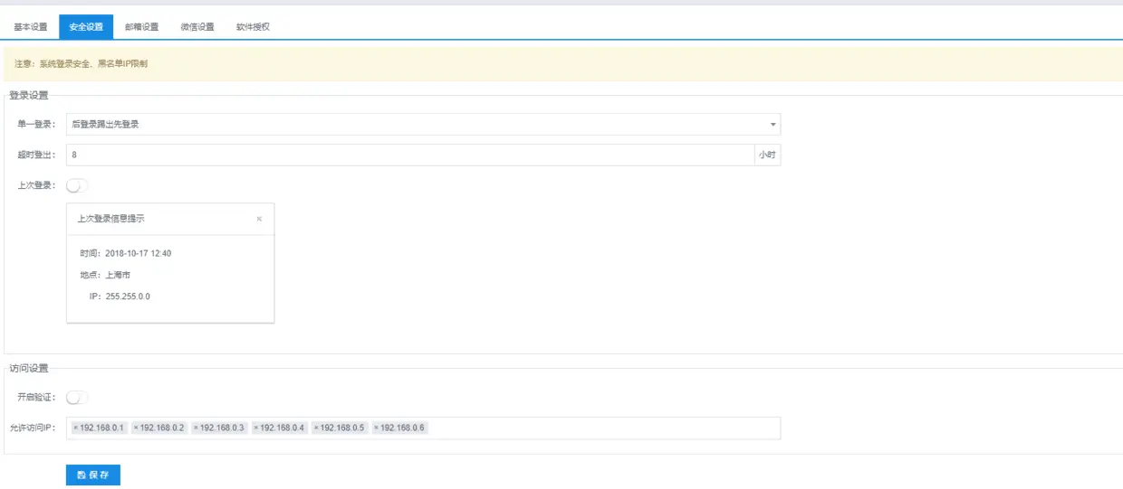 系统安全设置单词登录时间设置、上次登录地方以及应许访问IP地址;