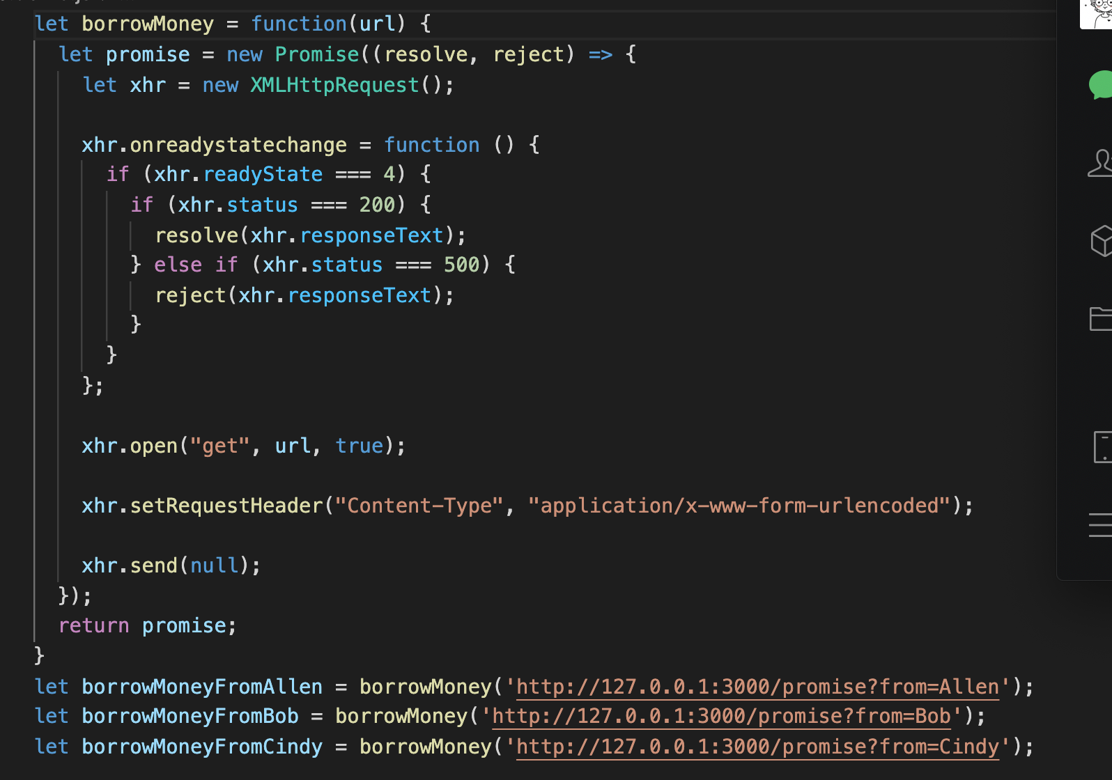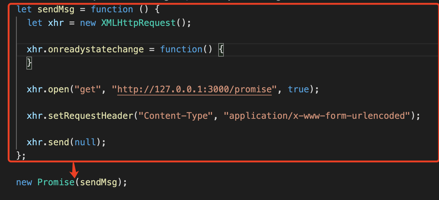 你决定给一个朋友发微信消息“求求你借我30块买喜茶,谢谢!”。用Promise应该怎么做呢?Promise本身的意思是“承诺,诺言”,你可以把它想像成一个小跟班儿,一个助理。给朋友发消息这种行为我们直接告诉它就可以了,让它替我们完成。给朋友发送消息,其实就是发送一个网络请求,如下图的sendMsg函数。我们把这个函数作为参数传给Promise。