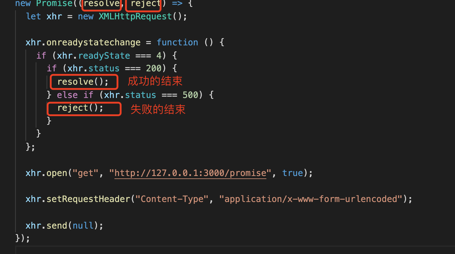 代码执行到这儿,其实已经把网络请求发送出去了。可是,小助理发送了消息之后呢?它想知道自己的工作怎样才算结束,不管是成功地达到了你的期望,还是失败了,总而言之,都算结束。那么你可以告诉它,要是朋友回了消息,不管回的内容是什么都算成功地结束了,要是你被对方删除好友,虽然失败,但也算是结束了。Promise自己提供了两个函数(resolve 和 reject )给你分别对应这两种情况。可以修改代码至下图,记住,new Promise()的时候传入的参数只要是个函数就可以了,不管是匿名函数体还是存储着函数地址的变量。