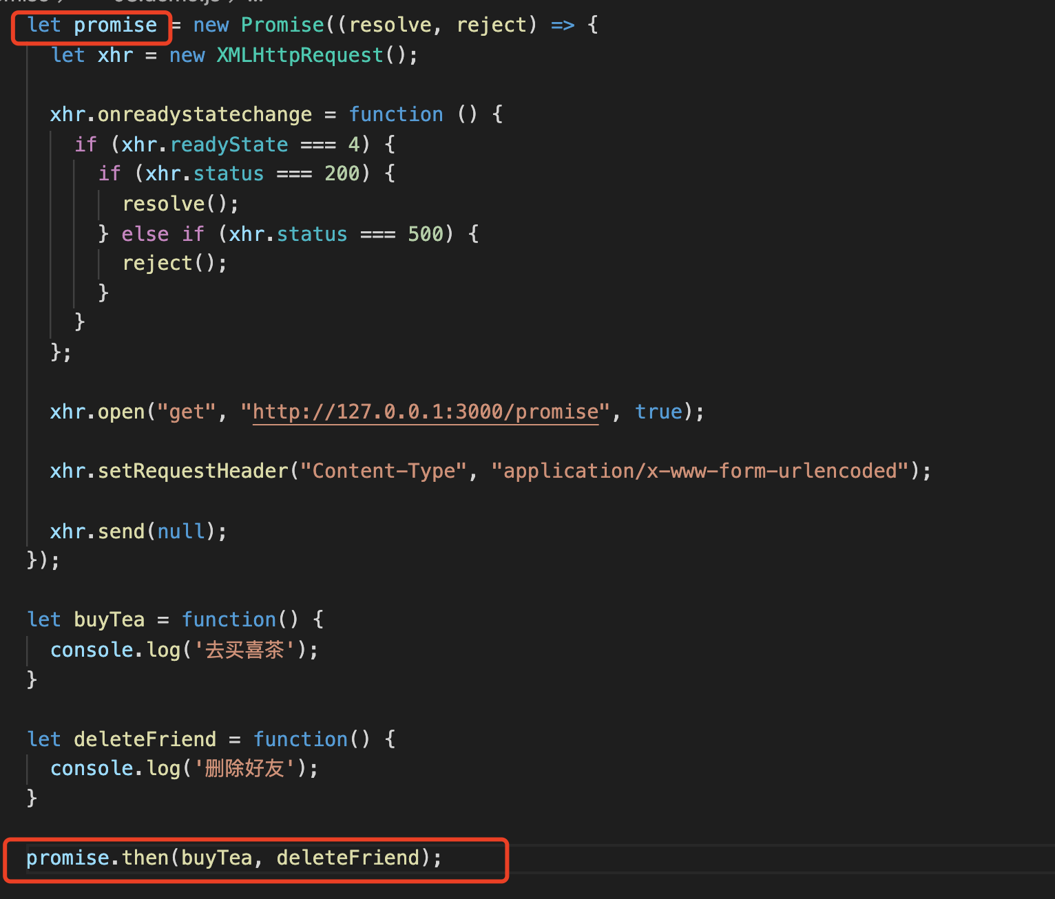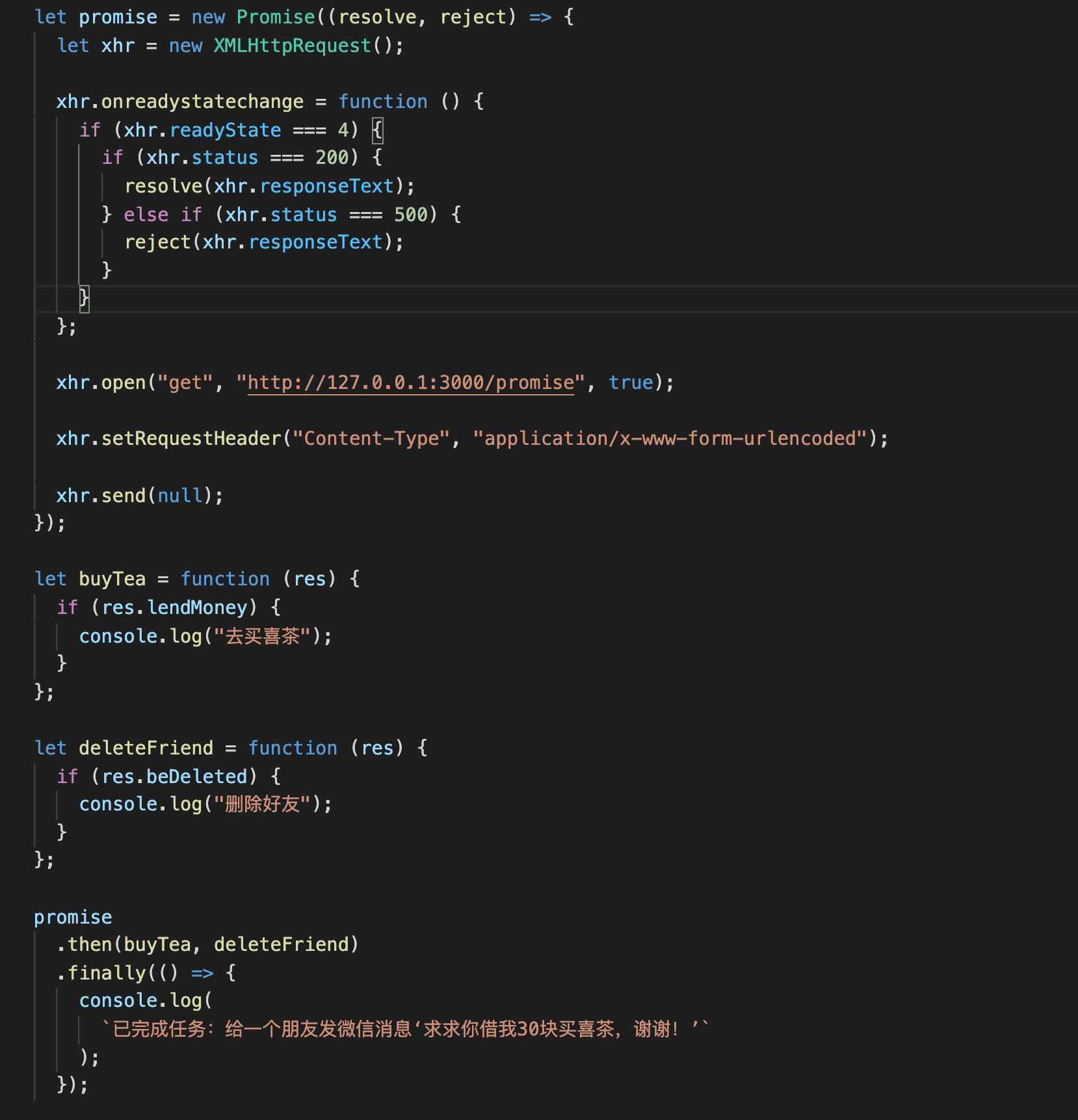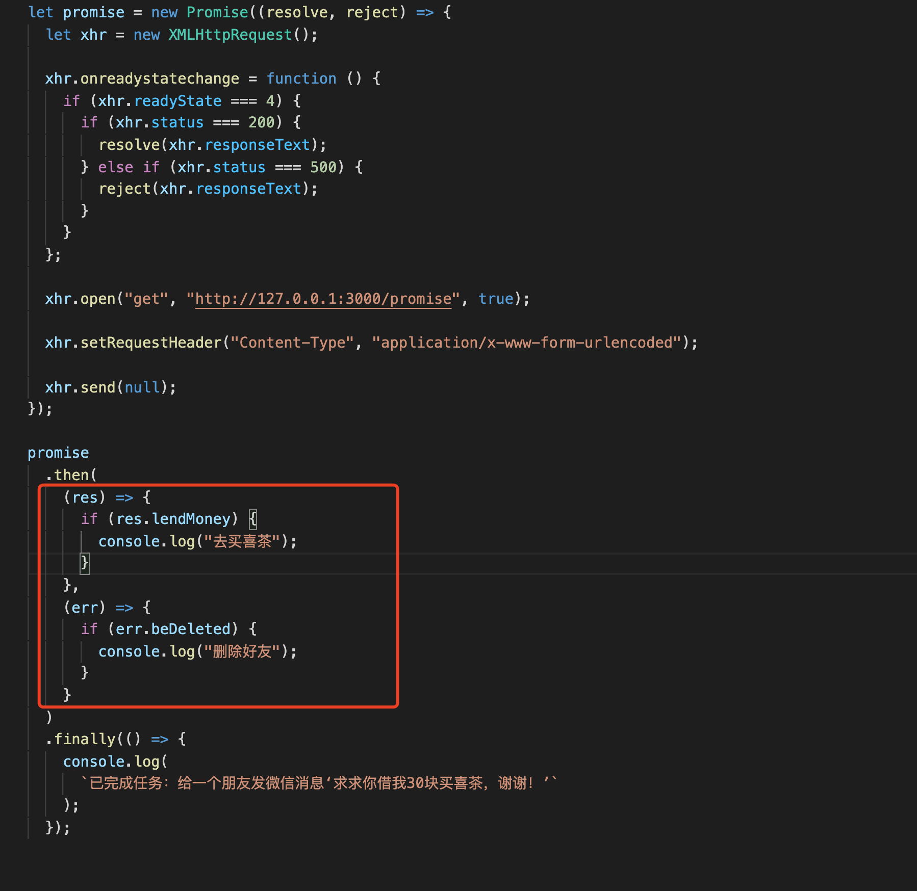 小助理发送了消息,自己也知道了结果,那么知道了就算了吗?当然不能,要是借到钱了,可以顺便让小助理把茶买回来,要是发现自己被删好友,可以让小助理顺便也把那个人给删了。这个时候就需要用到Promise实例(记住,是)的then方法了。让小助理买茶,我们用函数bugTea表示,让小助理删好友,我们用函数deleteFriend表示。不过你可能不止一个助理,我们要保证“借钱买茶”的是同一个助理,所以我们首先需要用变量 promise 存储new Promise() 的返回值,也就是一个Promise的实例。如下图: