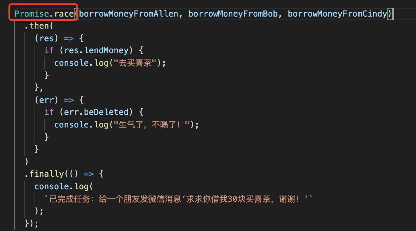 你无比迫切地想喝一杯喜茶,让一个小助理问你的一个朋友借钱,可能等了半天得到的只是拒绝,这样实在不划算,你完全可以多问几个朋友借钱,谁先转账就用谁的,要是有一个人率先拒绝了,那么不管剩下的人是转账还是拒绝,你通通都不管了,因为你生气了,不想再喝。race的本身就有“竞速比赛”的含义,所以显而易见,用Promise.race()这个API就足以实现上述场景所需要实现的功能。不过这次的代码我们需要稍微封装一下,因为向多个人发送借钱的消息的功能是没什么区别的。