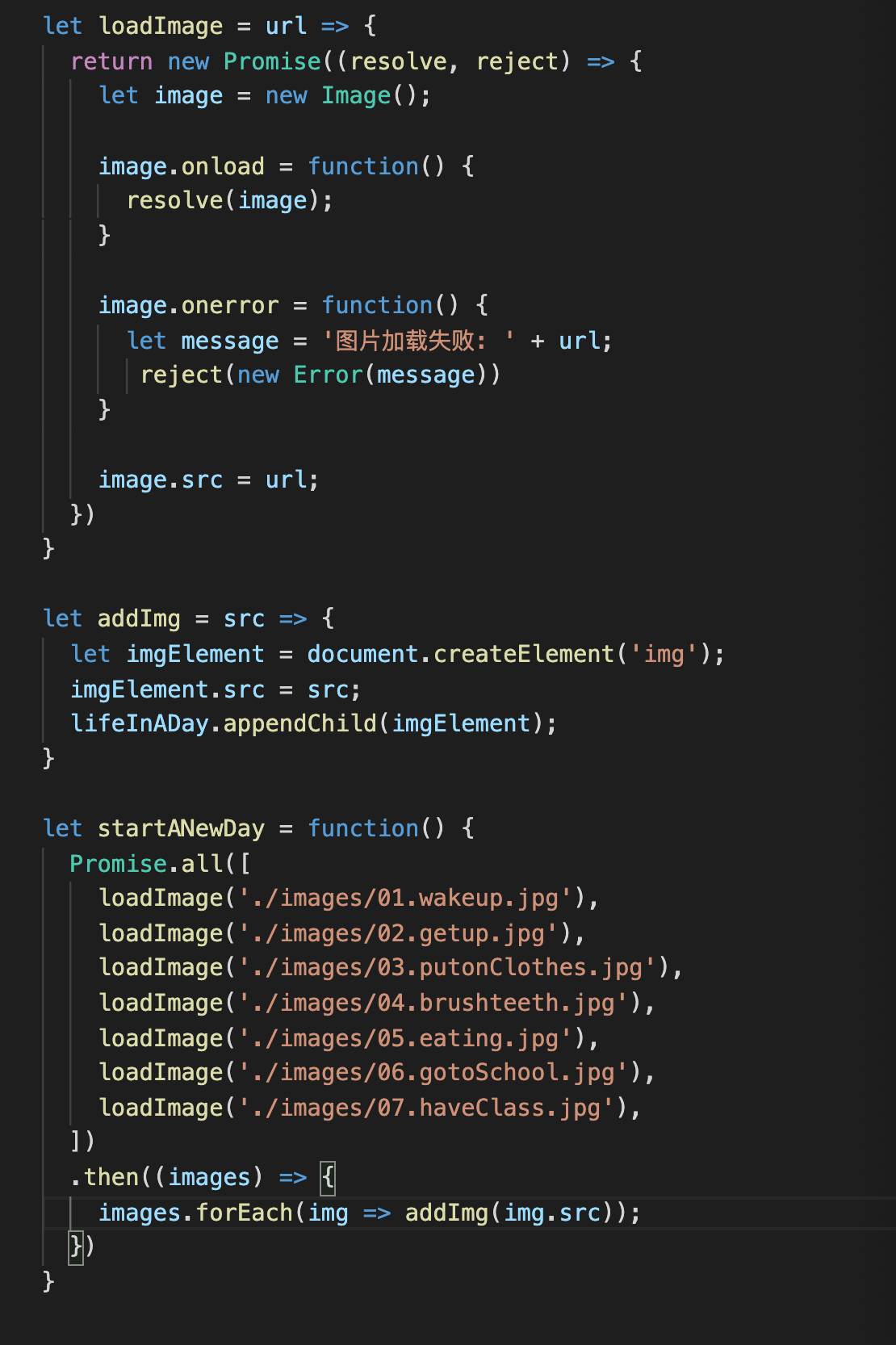我们可以放7个img标签在html文件上,但是,一般情况下,这样做无疑是回到刀耕火燎的时代。那么还有什么办法?一般来说,采用异步加载的方式是首选。通过new Image() 创建一个对象,拿到图片,再渲染到页面上。可是一共有7张图片,而且它们需要按照固定的次序展示,那应该怎么做呢?毫无疑问,最终的代码会如下图所示。
